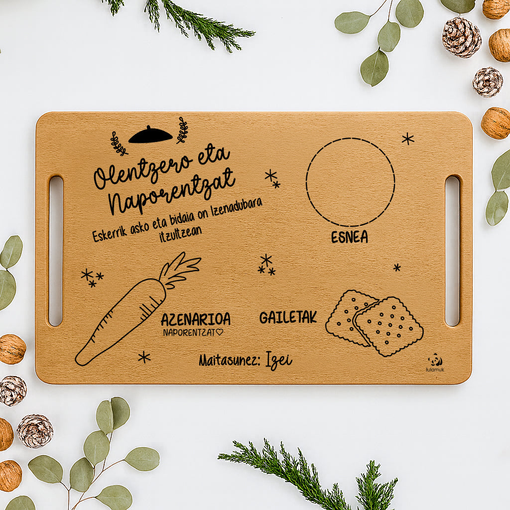 Para que tu peque preparé con ilusión la visita del Olentzero. Déjale esta bandejita bajo el árbol la noche de Navidad con galletas, un poco de leche y una zanahoria.