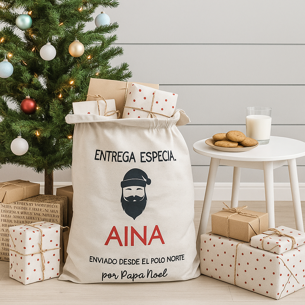 La época navideña es una época mágica y emocionante para los peques y no tan peques. Para ello contarás con este bonito saco personalizado con diseño exclusivo de Lulamuk, donde Papá Noel podrá dejar los regalos.