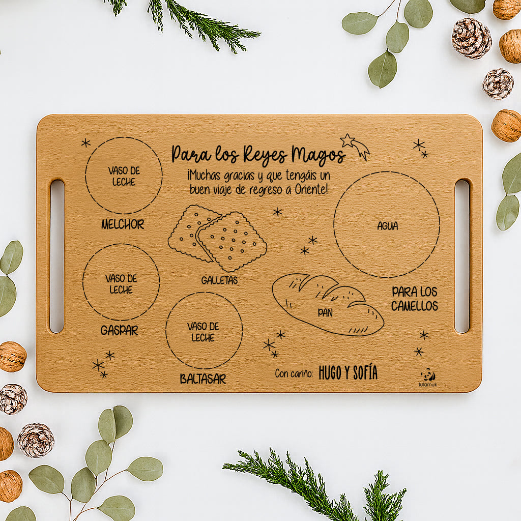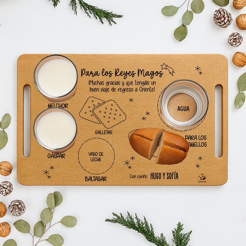 Para que tu peque preparé con ilusión la visita de los Reyes Magos. Déjale esta bandejita bajo el árbol la noche de Reyes con galletas, un poco de leche, agua y pan.